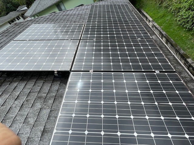Solar Panel Cleaning is a vital service to perform in order to maximize your energy savings! A homeowner in Kaneohe noticed dark algae stains covering most of his solar panels. The organic growth was also visible on his asphalt shingle roof, leaving black streaks, as well.
